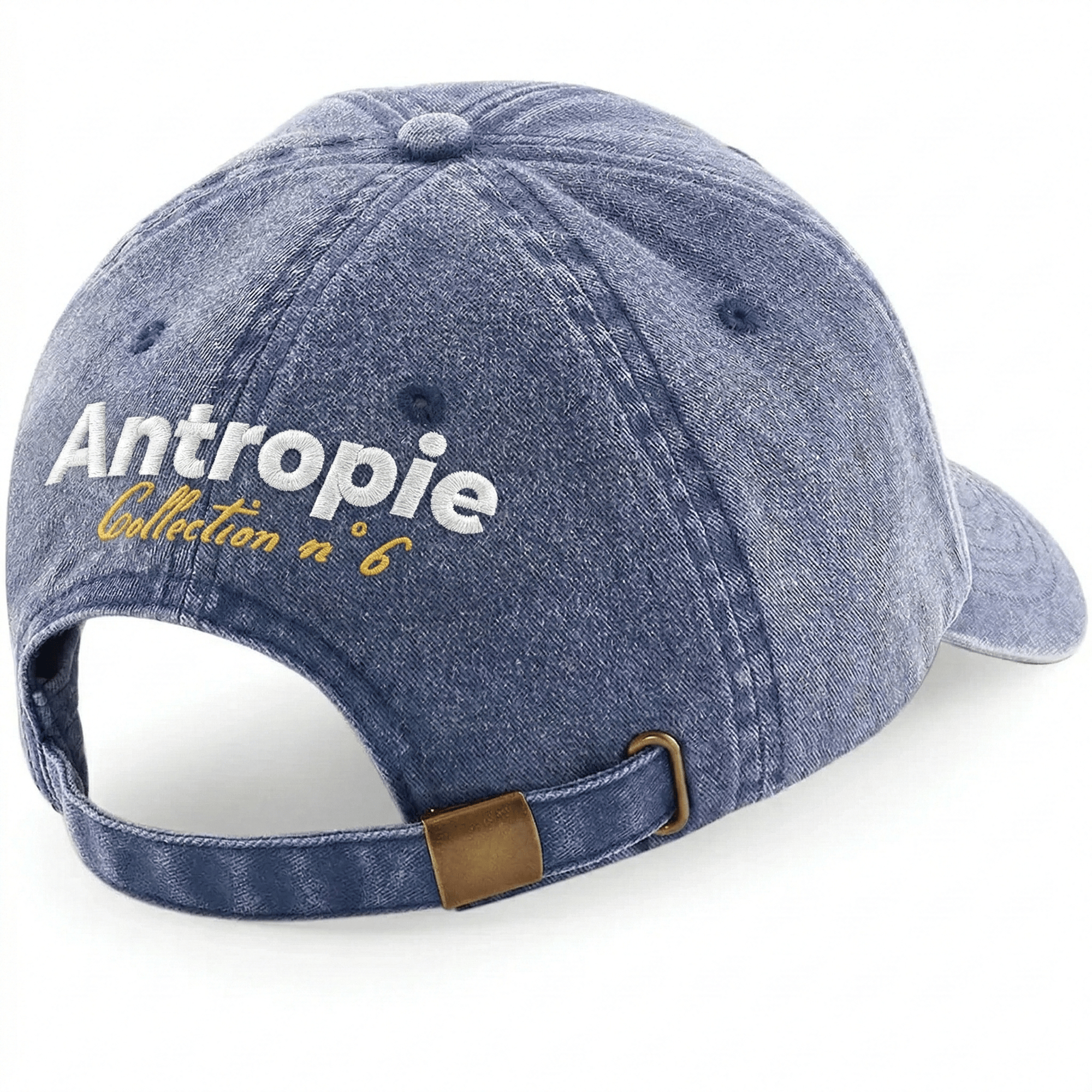 Même univers, autre silhouette. La casquette Collection n°6 reprend les codes d'Antropie dans un format du quotidien — citron brodé sur le devant, signature au dos. Fabriquée pour durer, conçue pour être portée.
